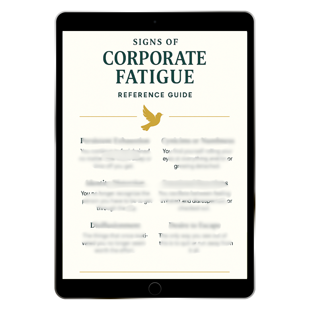 This printable guide helps you identify the hidden signs of corporate fatigue—the slow erosion of peace, purpose, and identity caused by toxic work environments. Recognizing what’s really happening is the first step toward freedom. Inside, you’ll discover: